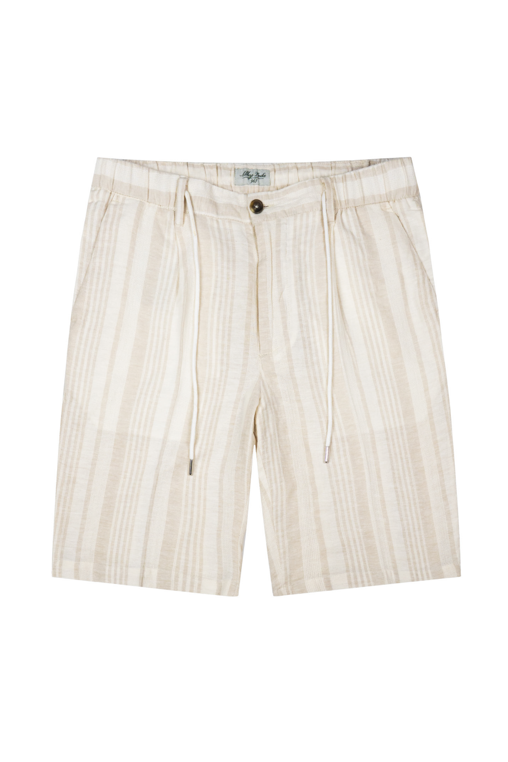 Bermuda a righe bianco e beige, caratterizzati da una trama del tessuto che varia da riga a riga, creando un raffinato gioco di texture.