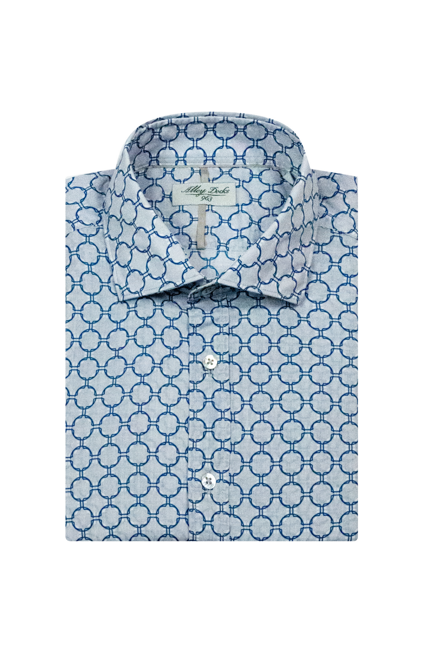 Camicia a maniche lunghe con collo alla francese, realizzata in 100% cotone. Il tessuto grigio è valorizzato da una fantasia geometrica nei toni del blu che conferisce al capo un carattere distintivo, mantenendo un’eleganza equilibrata e moderna.