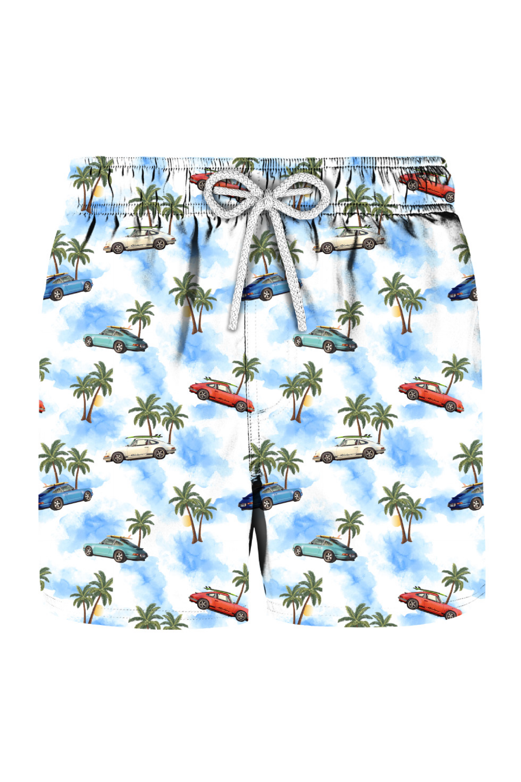 Costume da bagno light blue con auto e palme. Dotato di coulisse e tasche laterali. Sul retro presenta una tasca con chiusura magnetica.