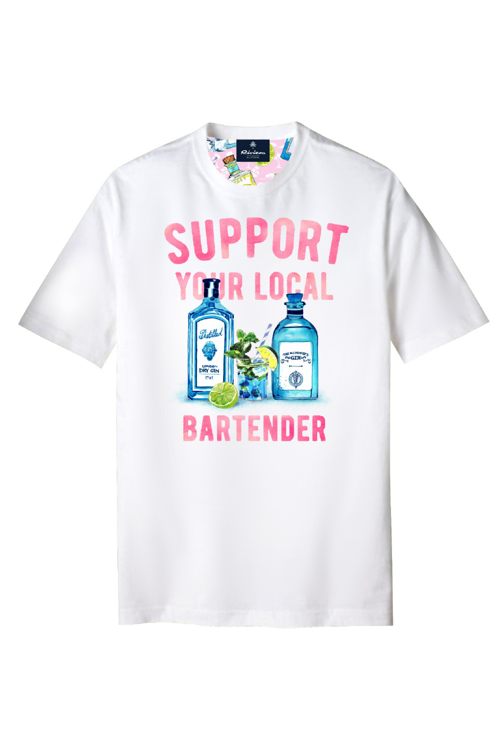 T-shirt optical white in 100% puro cotone, pensata per chi ama l’atmosfera vibrante dei cocktail bar e la condivisione dei momenti migliori. La stampa raffigura bottiglie di gin e un gin tonic servito con ghiaccio, menta e lime, accompagnati dalla scritta “Support your local bartender”.